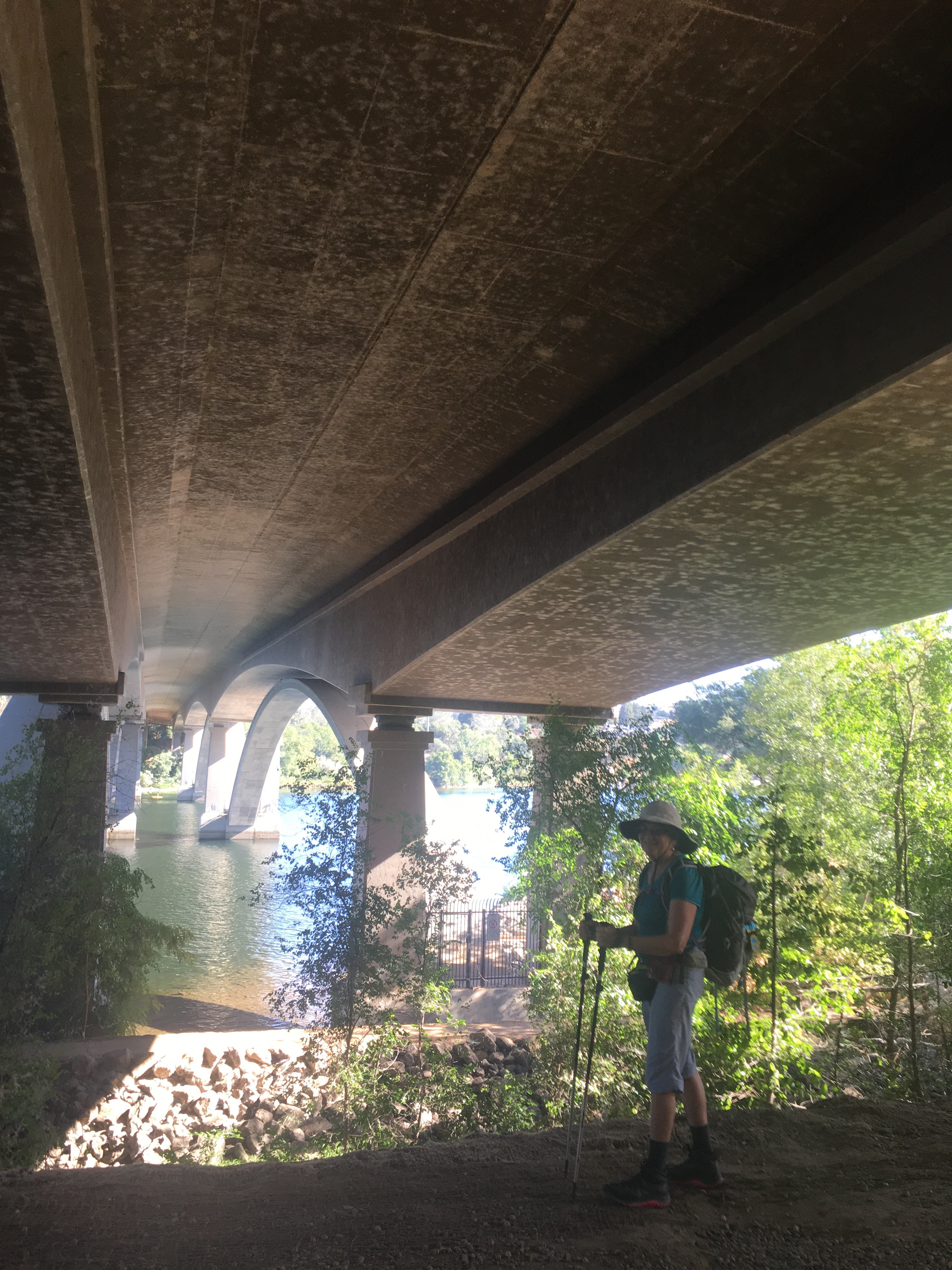 My daughter is a frequent hiking partner. I hand her my phone camera frequently to document our training. Here I am under the Folsom bridge. Miles of trails and beautiful views. So peaceful off the busy bike path. We walked on the trail along Lake Natomas in Folsom on Sunday. Most of our walking was on hard paved bike trail. Too hard for me. I like softer dirt and grass. Makes me wonder how my body will like the Camino Portuguese, which is known for lots of hard walking surface. Another mystery.