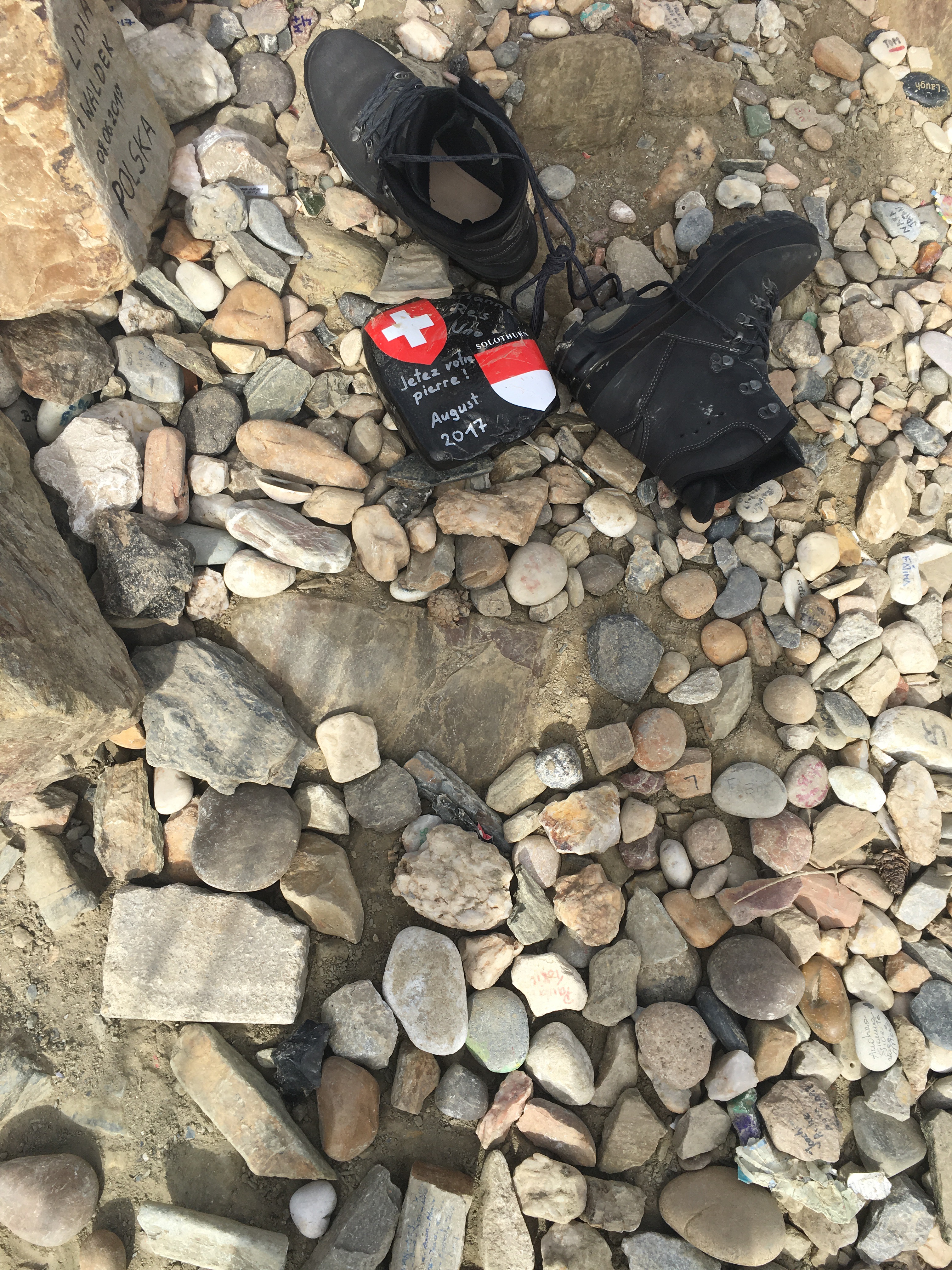 I handed my phone to a Pilgrim who was below the cross area and asked him to take a photo. There were several people placing stones, but rather than waiting for the mound to clear, I felt a comfort in being in this spiritual and ancient place of healing with others.