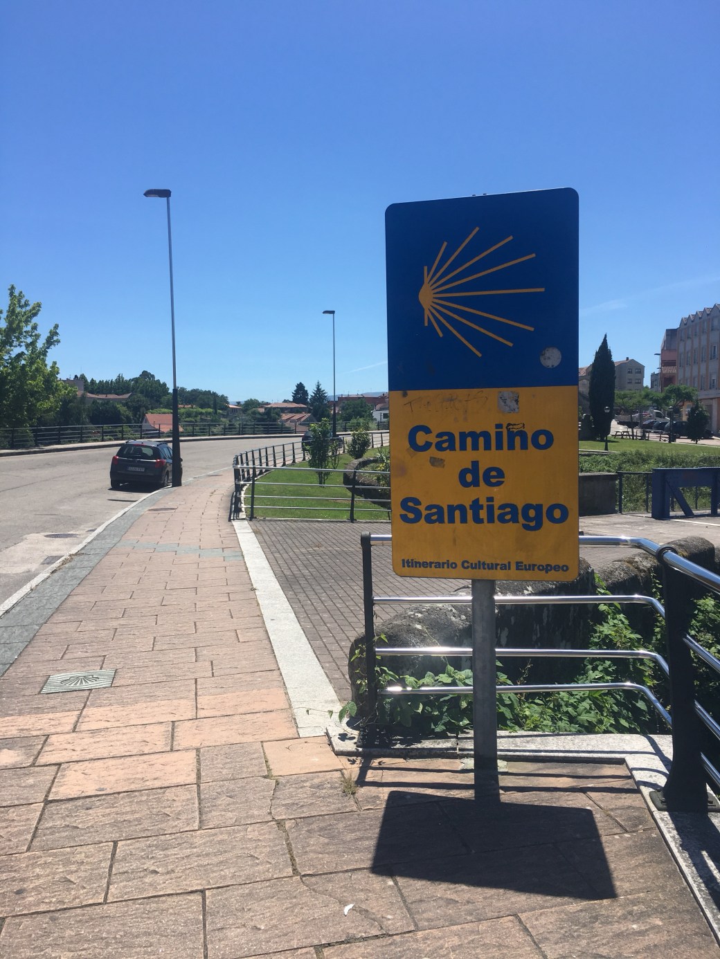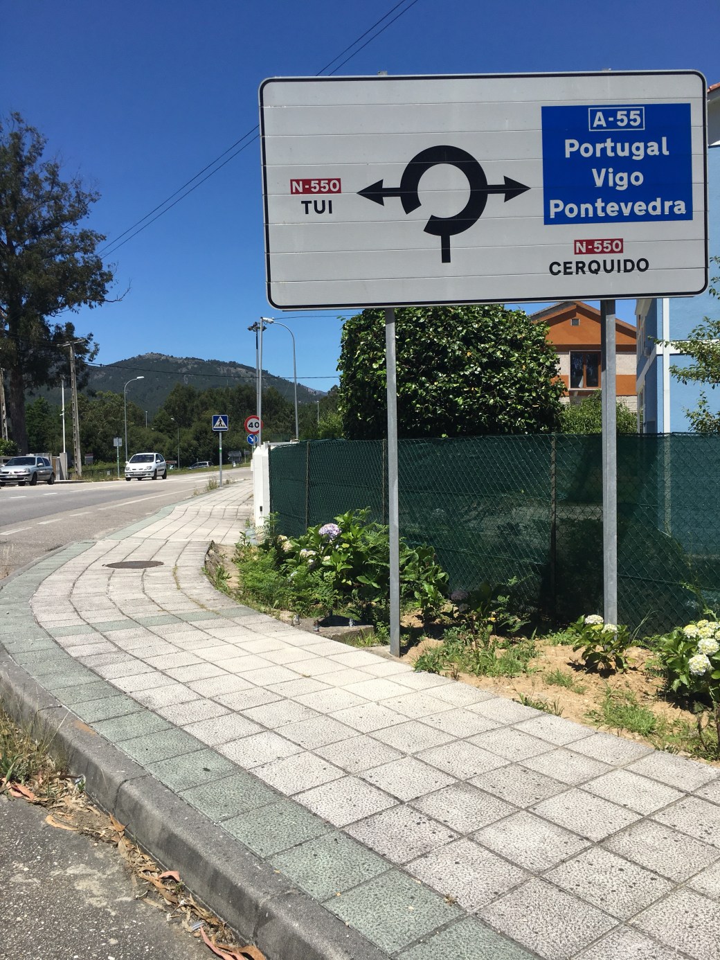 Directions from the Guillarei Estación must have been for a car, as the only arrows I saw for miles were commercial and I walked on the highway, like Hwy 49. I was lucky to talk to many locals, who helped me find my way through Tui Spain to Valença Portugal.