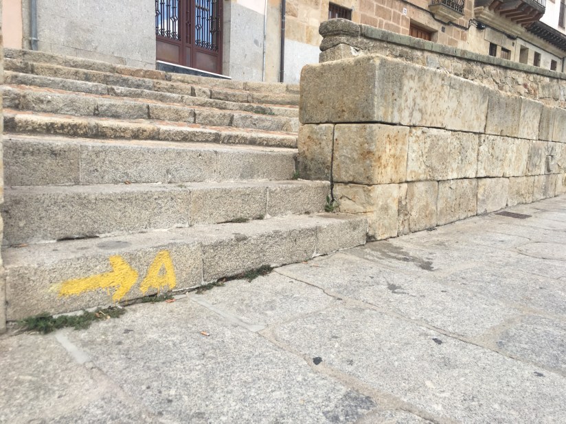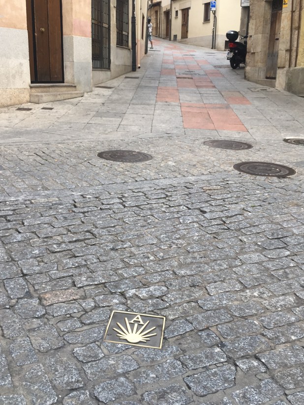 And again, the reminder why I’m here: walking into Salamanca on the Camino de la Plata and the merging of other Caminos, (Notice the A on the Camino arrow at top of page) are pilgrims. I think I know the difference between tourists or pilgrims only if they are wearing their backpacks or walking a bit slow in sandals. So far today, I met Fred from Los Angeles, who started in Seville and is on his way to Santiago. He confirmed the advice to carry adequate food and especially water, as the stages are long and the services fewer and farther between in the VDLP than the Francés. A pilgrim couple from Montreal waved from afar.