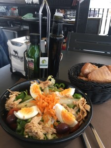 Waiting for my room at my Hostal Alda Entrearcos (this is a family run small hotel/guest house with fewer amenities but very comfortable: check out the amazing views from my fifth floor window) I sat under an umbrella in a sudden downpour, eating my first salad mixta in Spain. It was 4:00 p.m. and adults sat around the table, while children played.